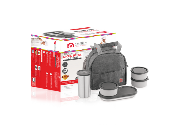 NanoNine Micro Steel Chapati Combo with Tumbler (3+2) Stainless Steel Containers 250ml x 3, 1 Chapati Box, with 1 Tumbler and Insulated Bag for Fresh and Delicious Meals On-the-Go