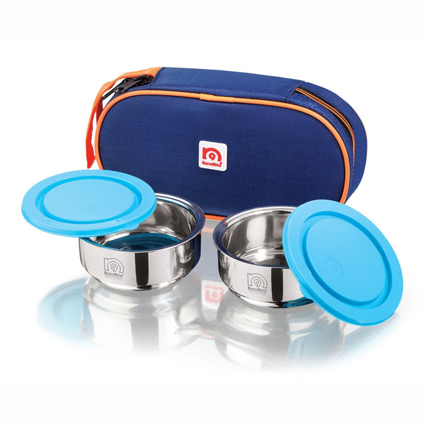 - Contents : 2 N Stainless Steel Container, Capacity 225 ml X 2, 2 N Plastic Lid, 1 N Tiffin Bag.