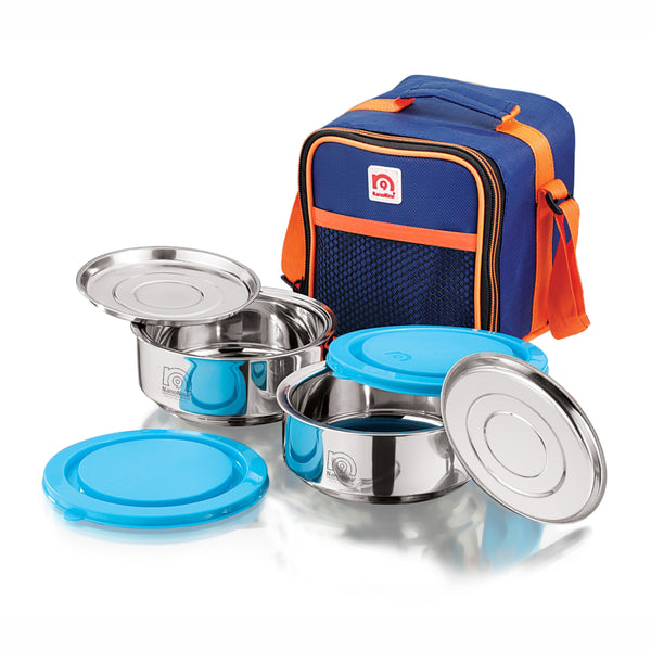 NanoNine Tiffiny 400 ml X 2 Double Wall Insulated Stainless Steel Lunch Box with Insulated Bag, Navy Blue