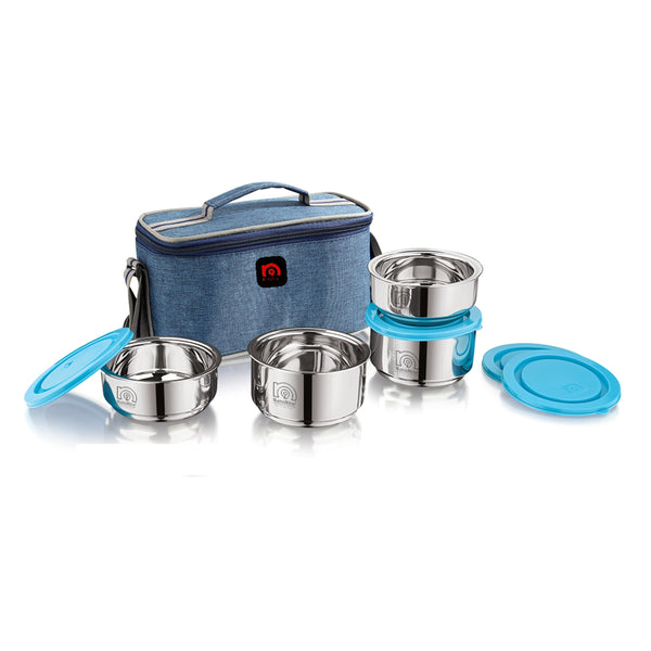 - Contents : 4 N Stainless Steel Container, Capacity 325 ml X 2 + 225 ml X 2, 4 N Plastic Lid, 1 N Tiffin Bag.