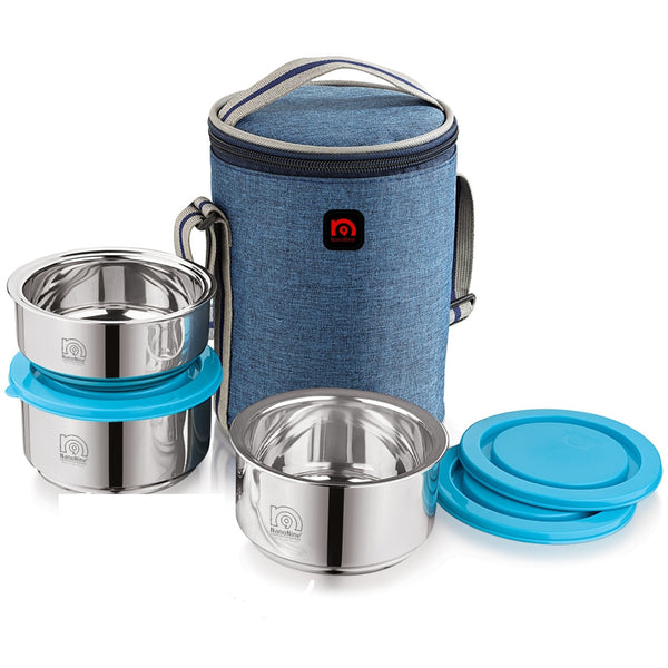 NanoNine Tiffiny Executive 325 ml X 2 + 225 ml Double Wall Insulated Stainless Steel Lunch Box with Bag, Denim Blue