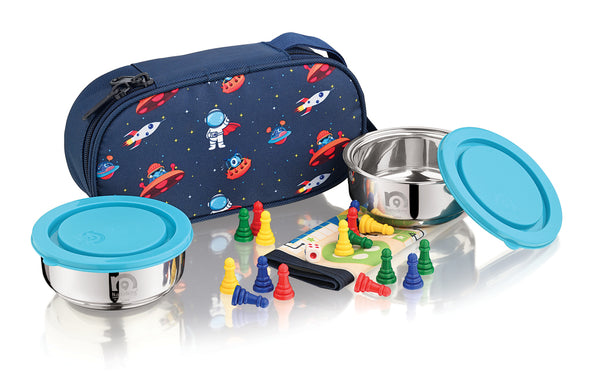 NanoNine Tiffiny Kidzo 225 ml x 2 Double Wall PUF Insulated Stainless Steel Lunch Box with Insulated Tiffin Bag with Surprise Gift (Ludo Table Mat).