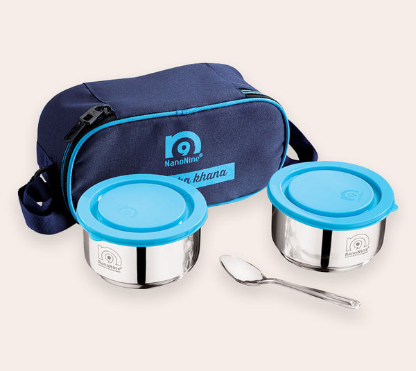 - Contents : 2 N Stainless Steel Container, Capacity 260 ml X 2, 2 N Plastic Lid, 2 N SS Plate Capacity 80 ml X 2, 1 N Tiffin Bag.