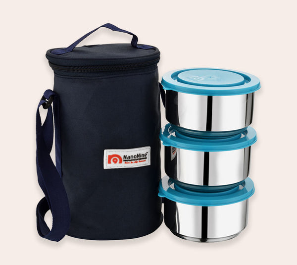 - Contents : 3 N Stainless Steel Container, Capacity 260 ml X 3, 3 N Plastic Lid, 3 N SS Plate Capacity 80 ml X 3, 1 N Tiffin Bag.