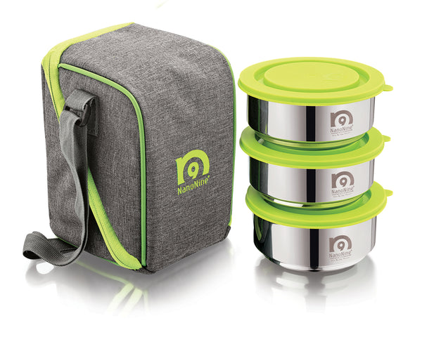 NanoNine Tiffiny Small Pro 375 ml X 3 Double Wall Insulated Stainless Steel Lunch Box.