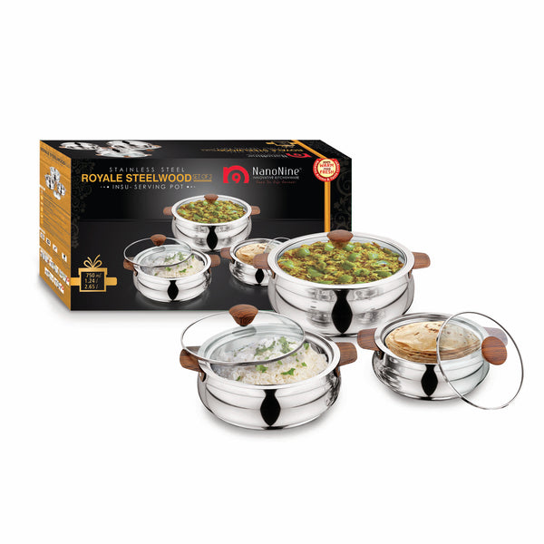 NanoNine Royale Steel Wood 750 ml + 1.24 L + 2.65 L Double Wall Insulated Stainless Steel Casserole with Glass Lid.
